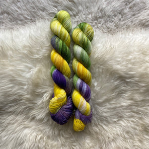 This colorway is inspired by the city of New Orleans! Please note that this colorway is highly variable. The skein you receive may have more or fewer patches of certain colors.